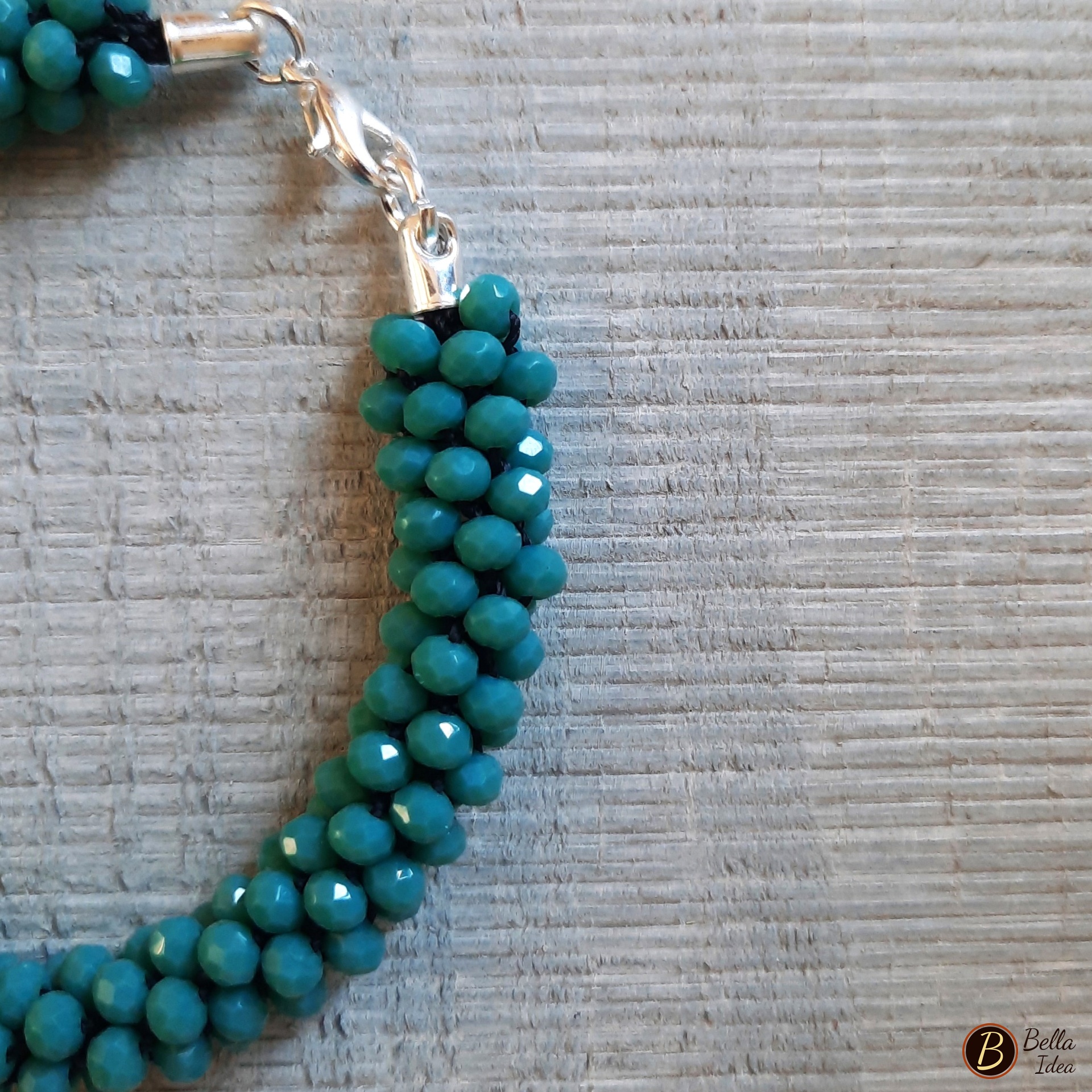 Braccialetto artigianale, realizzato a mano con tecnica Kumihimo, in perline di vetro sfaccettato turchese teal con chiusura a moschettone argentato.