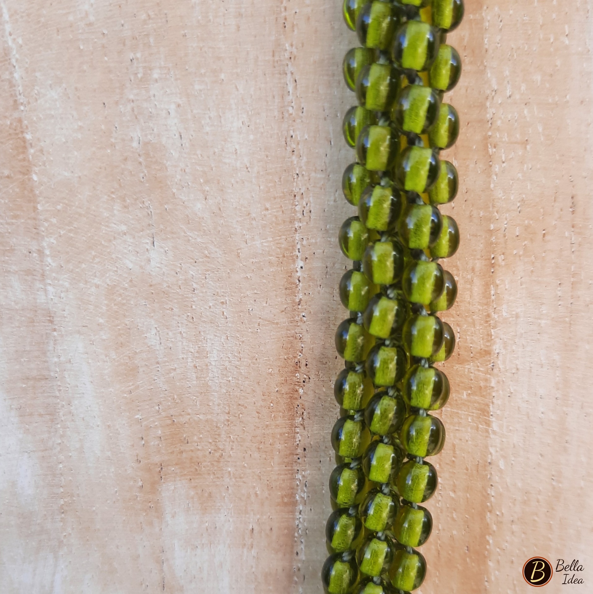 Collana artigianale, realizzata a mano con tecnica Kumihimo, in perline di vetro lumè color verde oliva e chiusura a moschettone ramato.