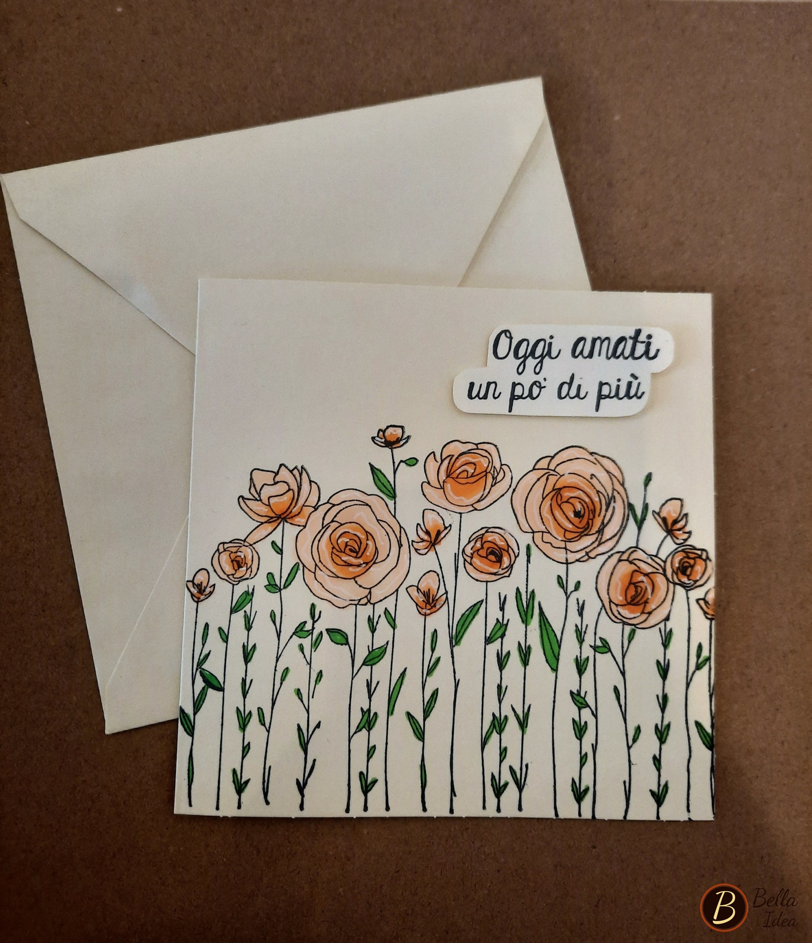 Biglietto quadrato, piegato con busta (14x14cm) in pregiata carta color avorio, stampato e colorato a mano.