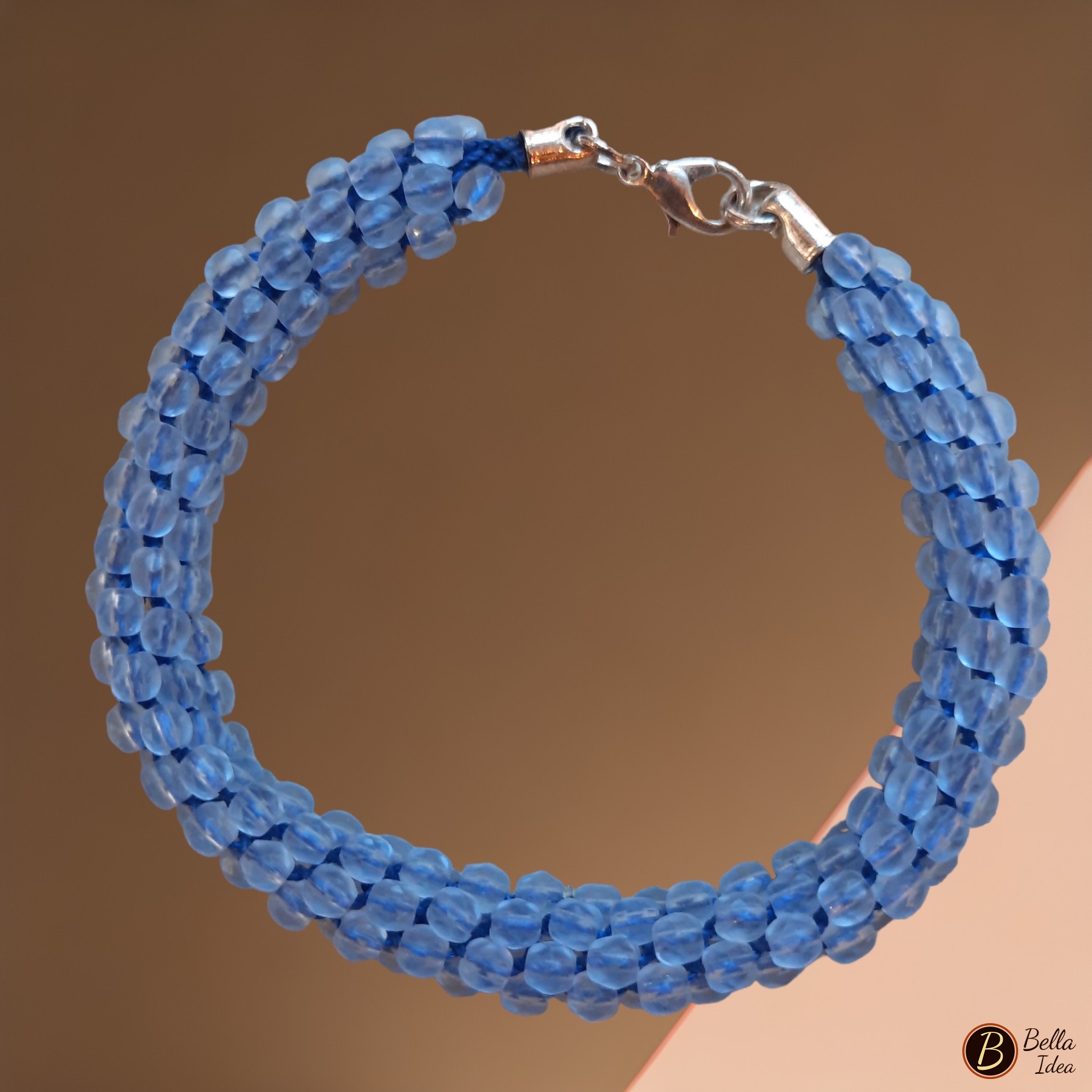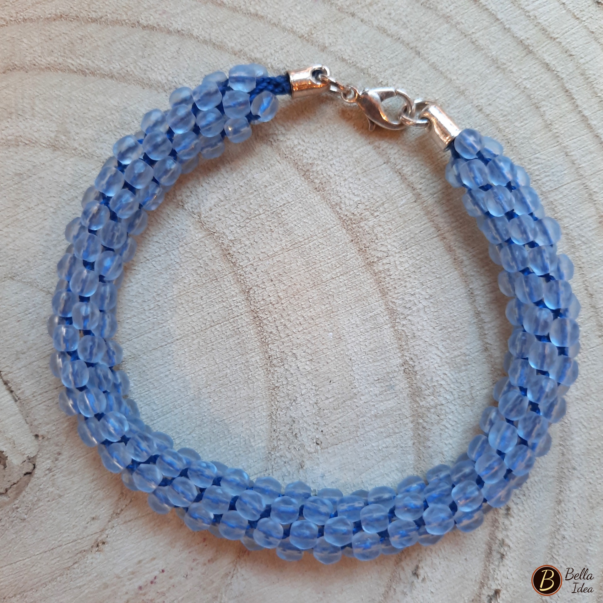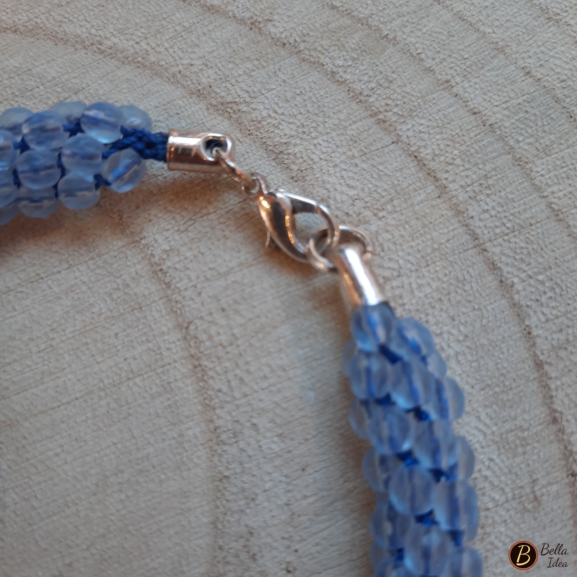 Braccialetto artigianale, realizzato a mano con tecnica Kumihimo, in perline in mezzo cristallo di color celeste e chiusura a moschettone argentato.