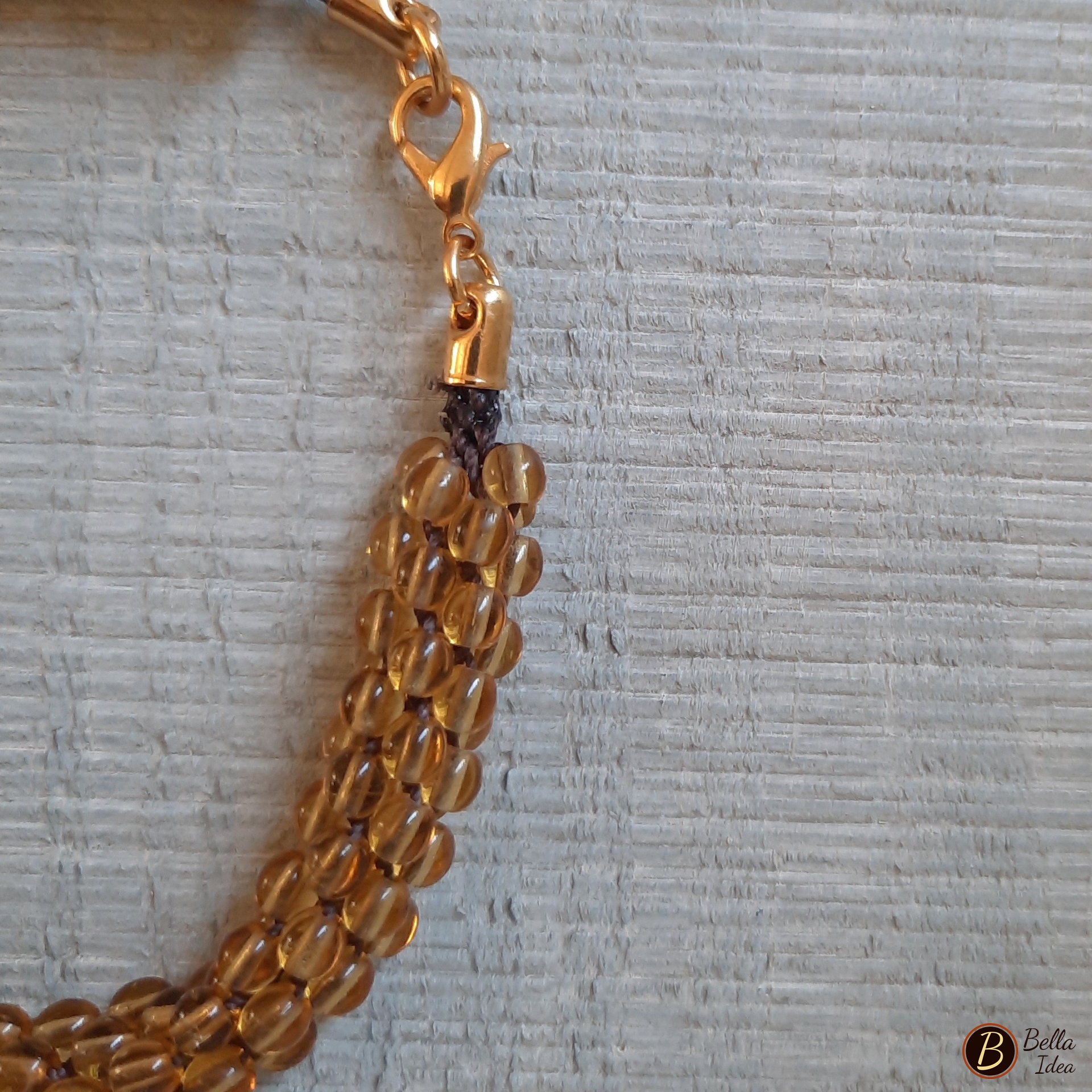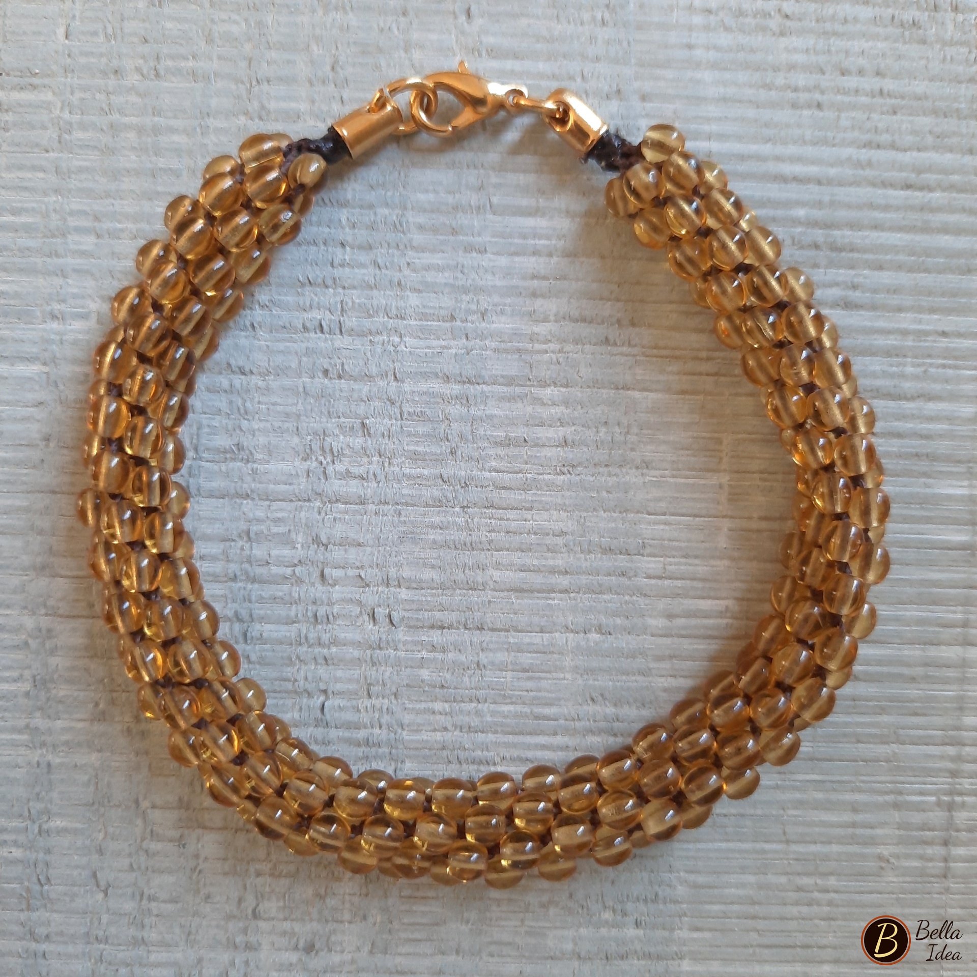 Braccialetto artigianale, realizzato a mano con tecnica Kumihimo, in perline di vetro lumè giallo ocra con chiusura a moschettone dorato.
