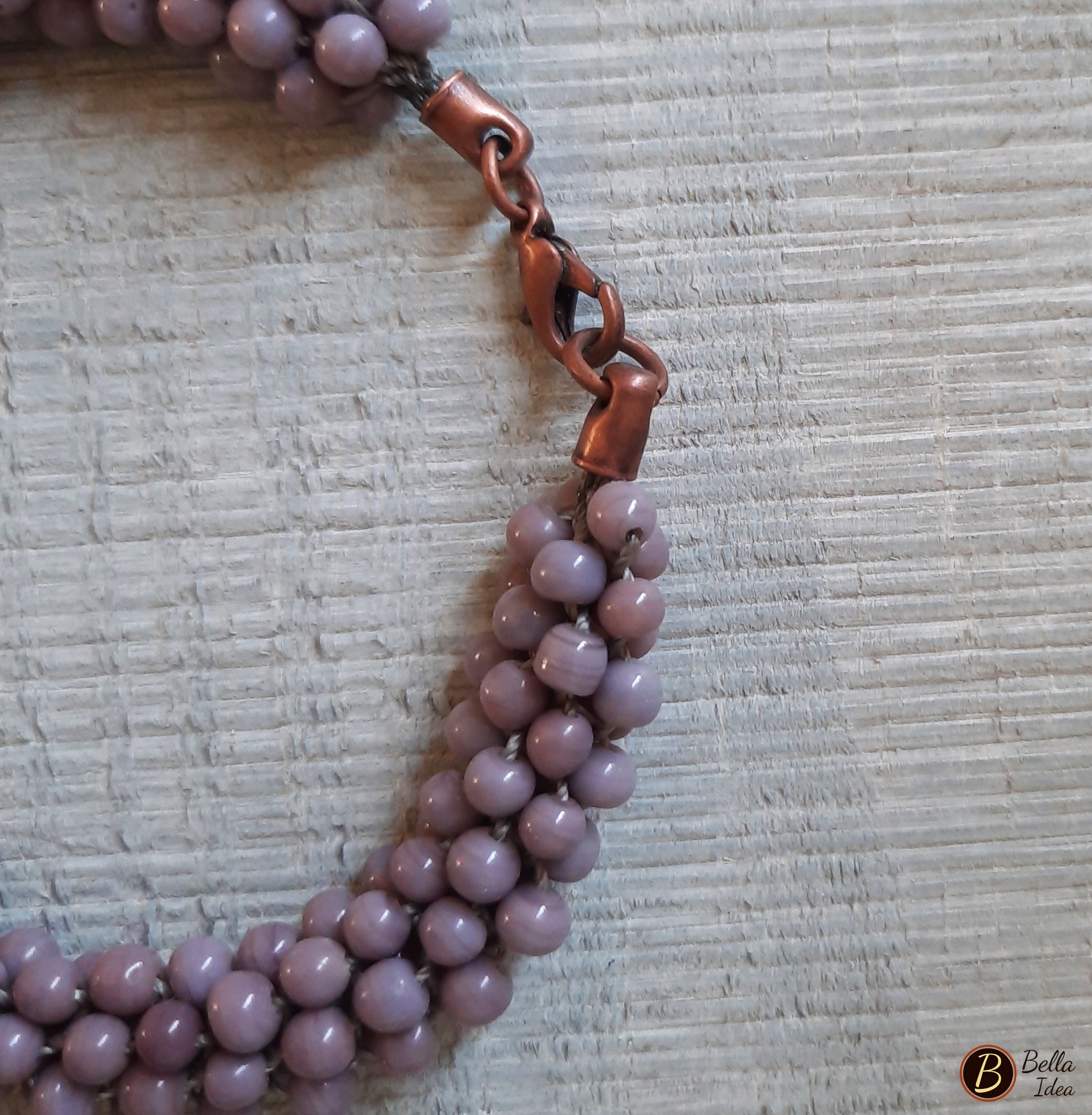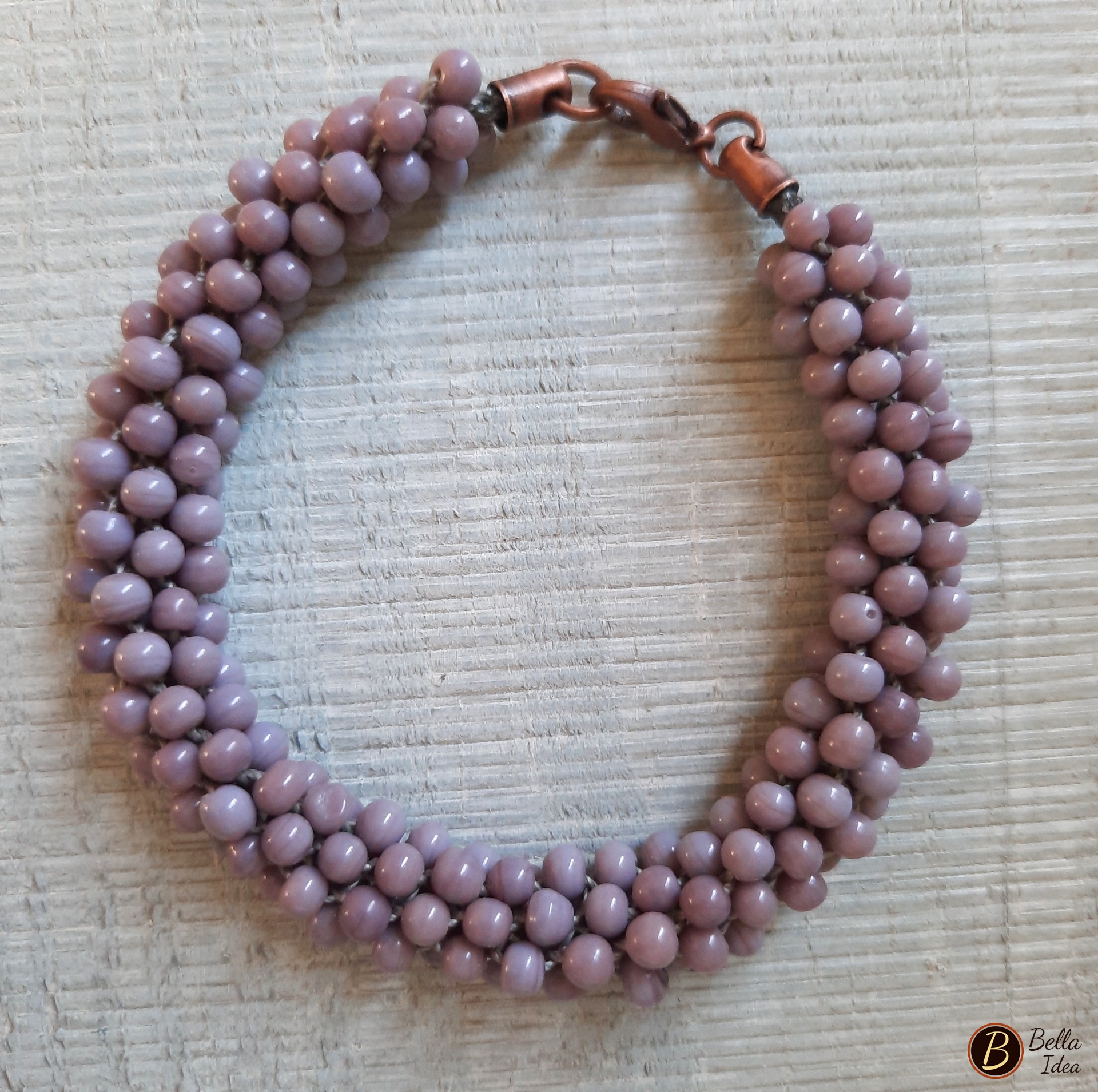 Braccialetto artigianale, realizzato a mano con tecnica Kumihimo, in perline lumè color glicine con chiusura in metallo ramato.