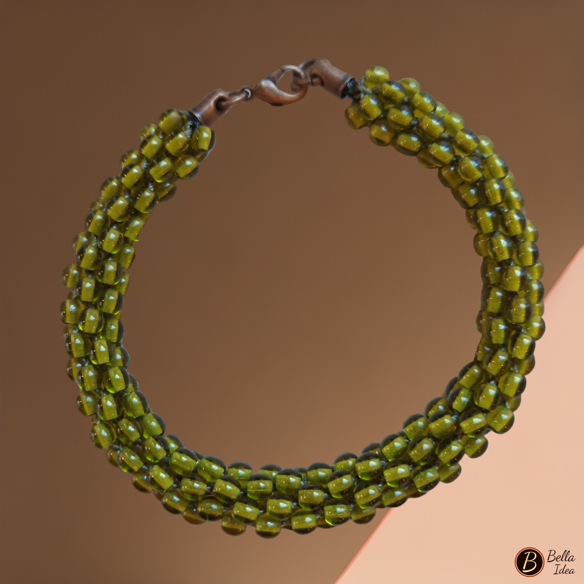 Braccialetto artigianale, realizzato a mano con tecnica Kumihimo, in perline verde oliva di vetro lumè e chiusura a moschettone ramato.