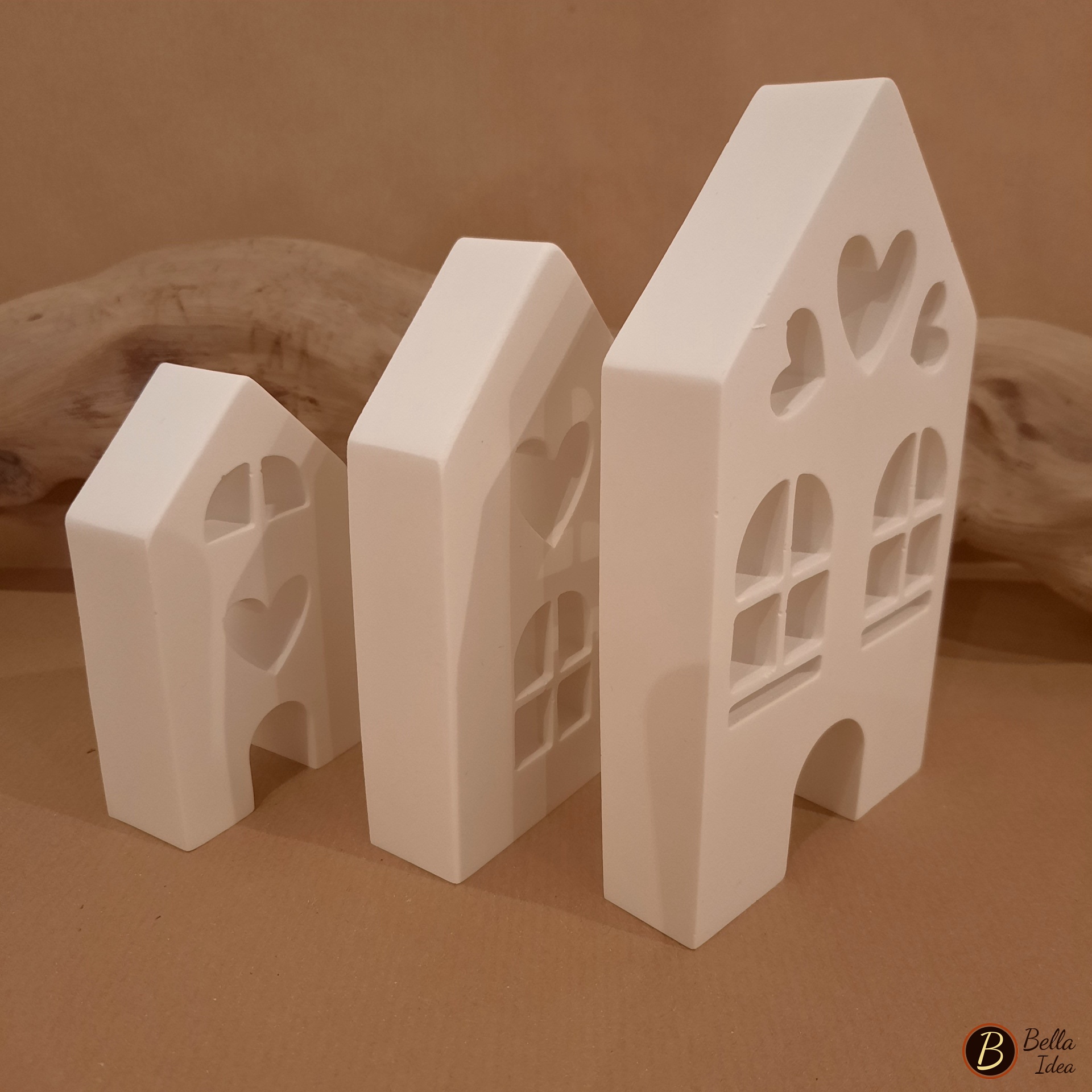 Tre diversi modelli di romantiche casette in gesso sintetico artistico di alta qualità (Diplast GV41) realizzate a mano singolarmente. Creazione dalle linee semplici ed eleganti adatta ad ogni ambiente.