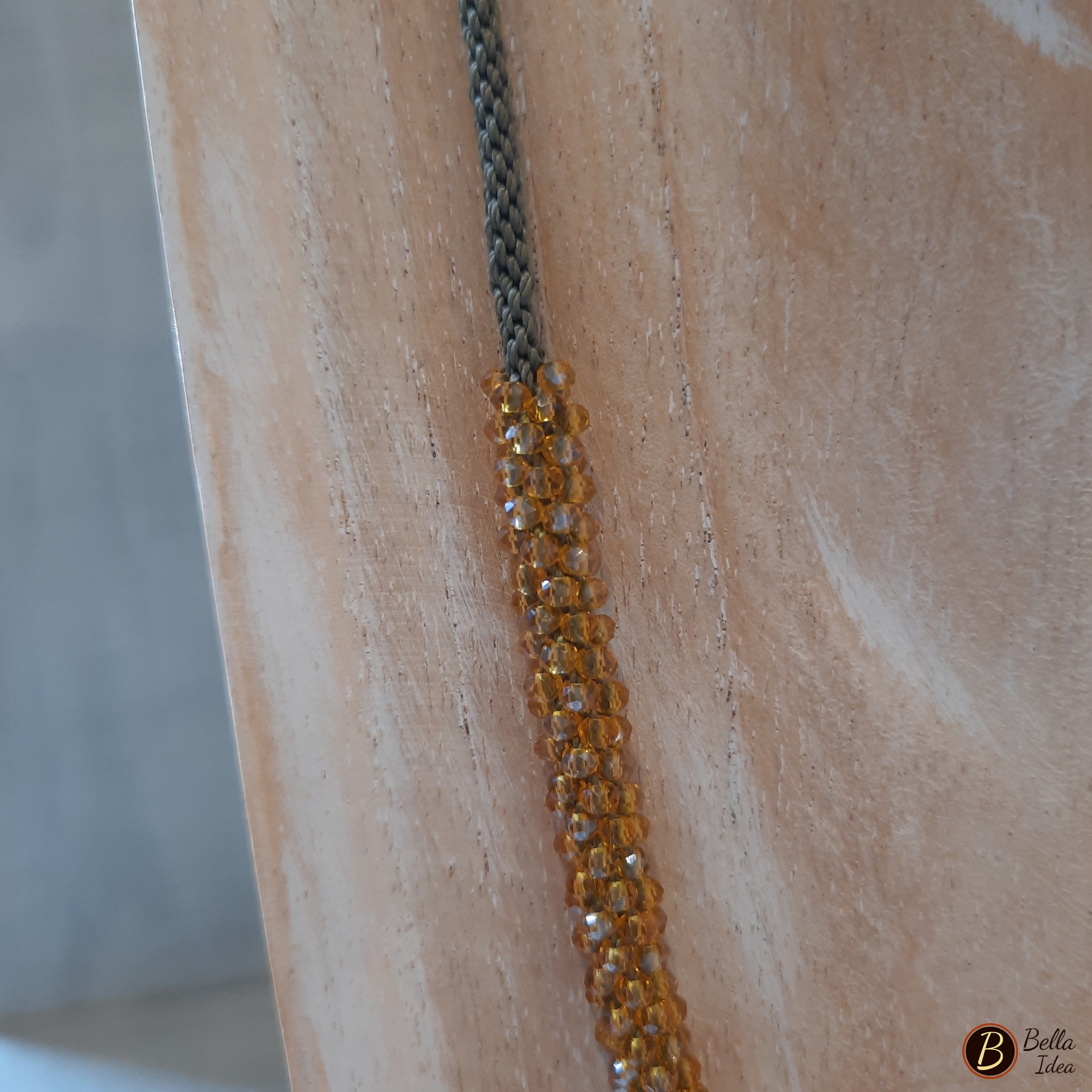 Collana artigianale, realizzata a mano con tecnica Kumihimo, in perline di mezzo cristallo giallo oro con chiusura a moschettone dorato.