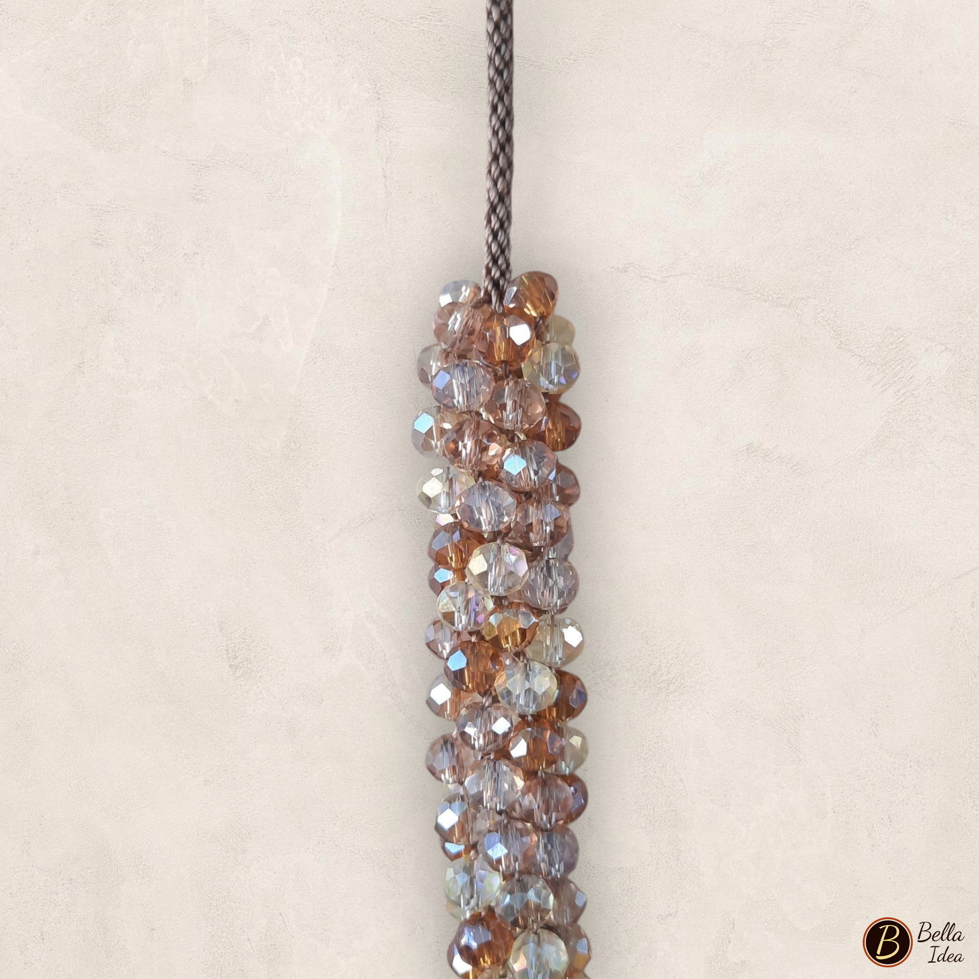 Collana artigianale, realizzata a mano con tecnica Kumihimo, in perline di vetro sfaccettato in diverse gradazioni di oro cristallo trasparente e giallino con chiusura a moschettone dorata.