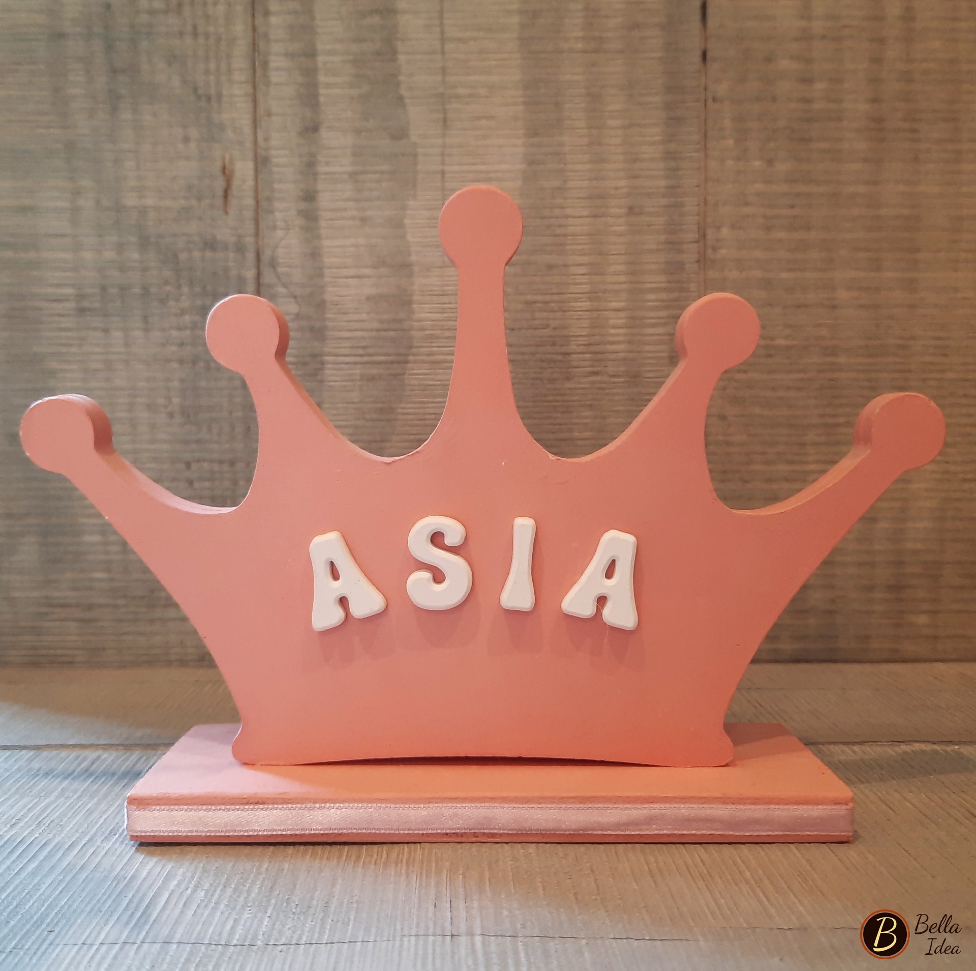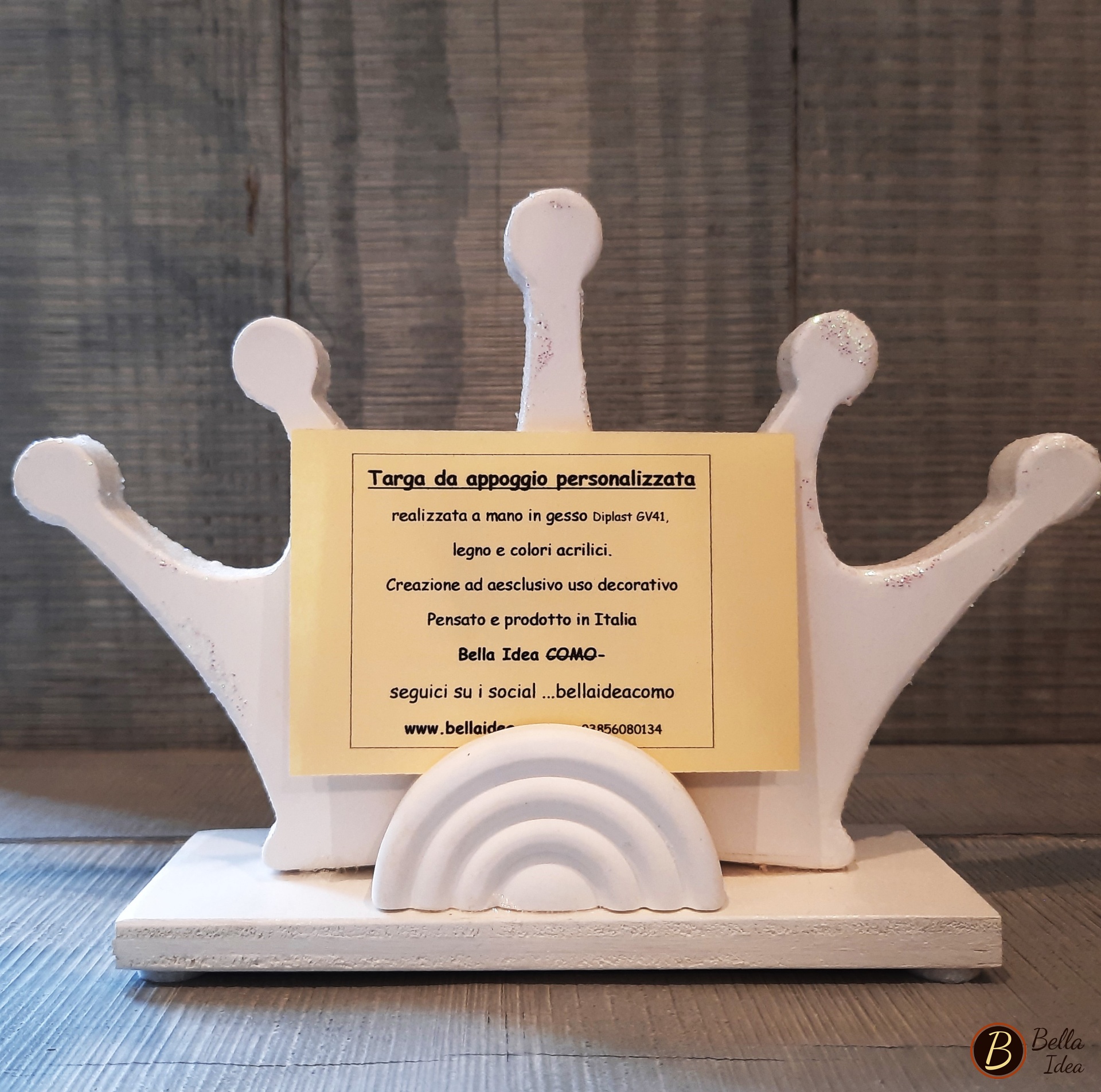Targa da appoggio, a forma di coroncina, personalizzata con nome, realizzata a mano in gesso sintetico artistico di alta qualità (Diplast GV41) su piccola base in legno e portafoto sul retro.