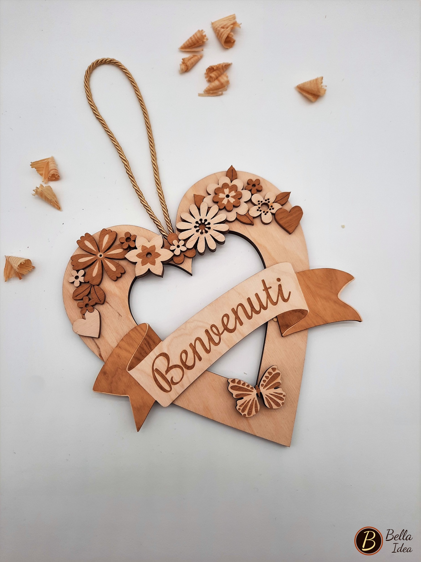 Fuoriporta in legno, a cuore di produzione artigianale Made in Italy, lavorato a laser con applicazioni in rilievo di fiori e farfalle . Leggero e originale è un discreto ma ricercato complemento d'arredo per il vostro ingresso che si adatta facilmente a diversi stili di arredamento.