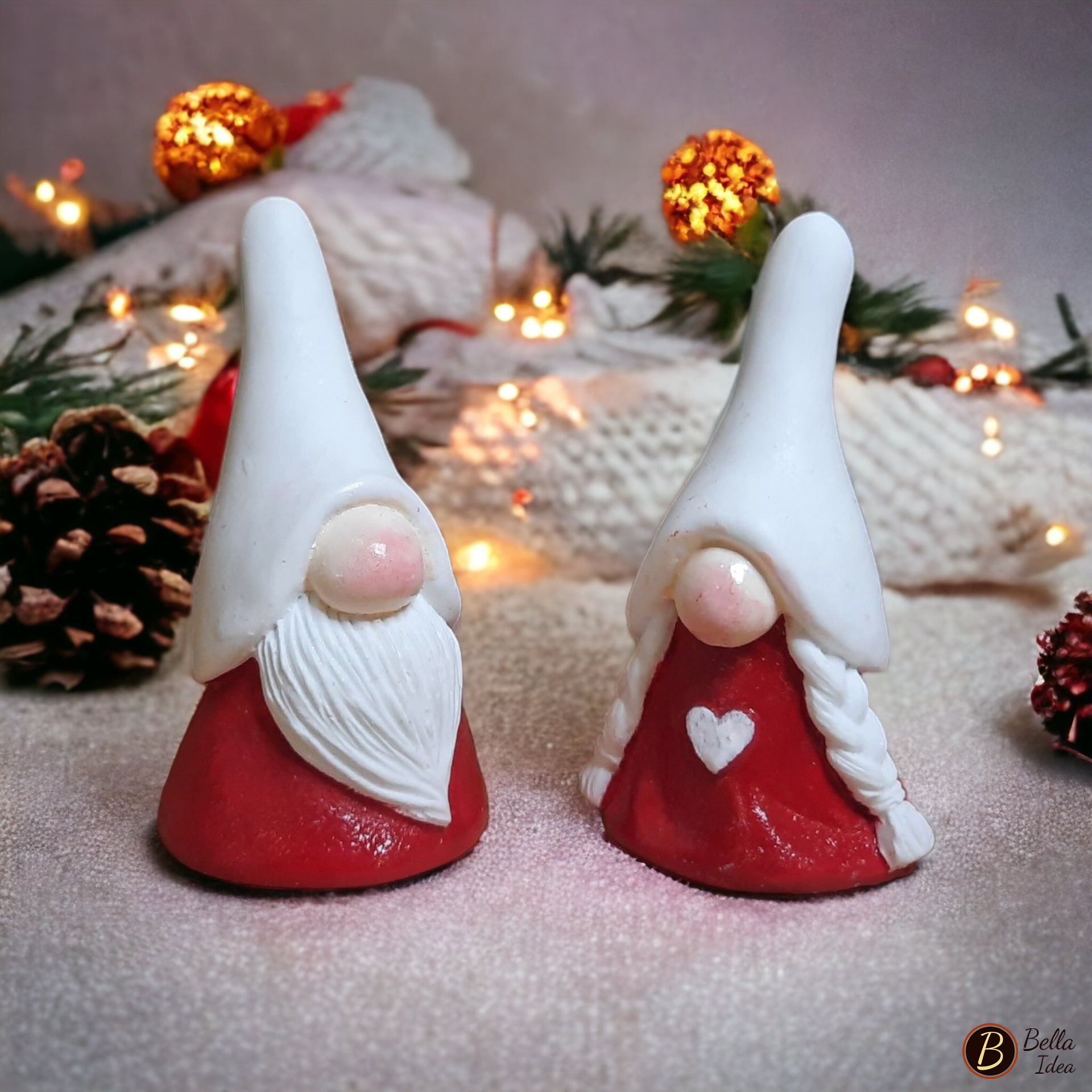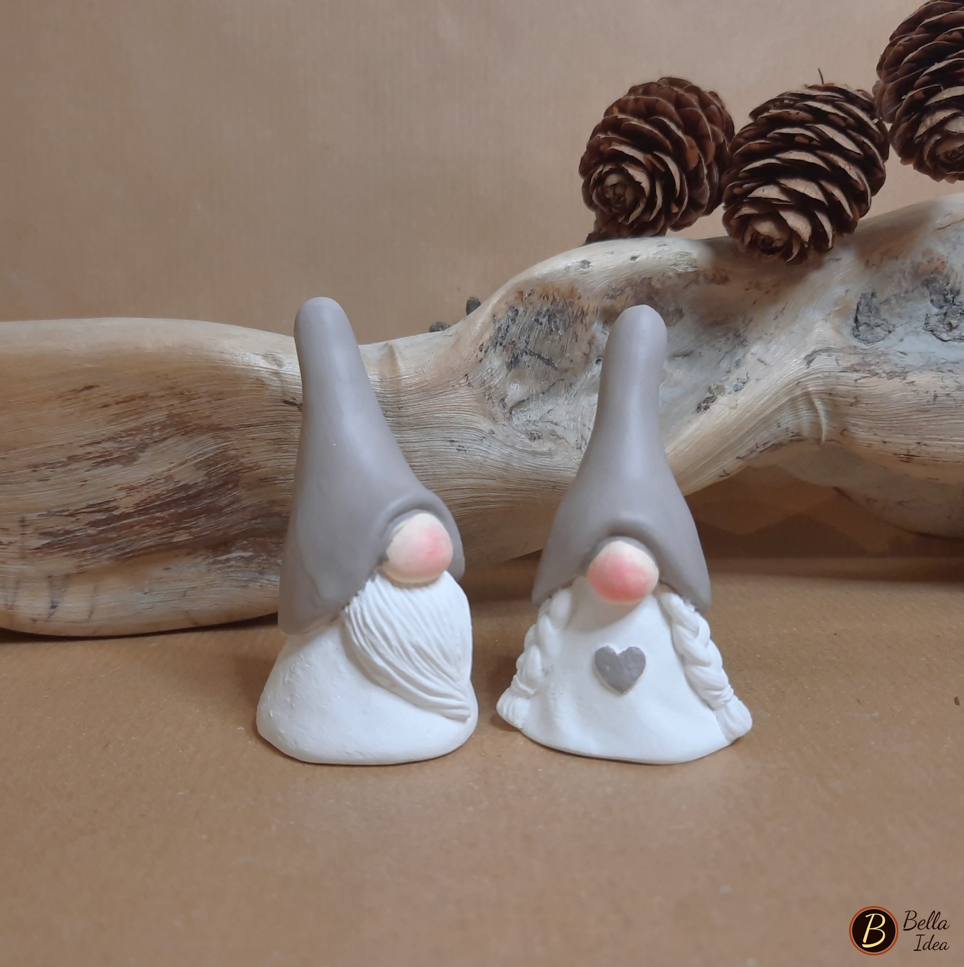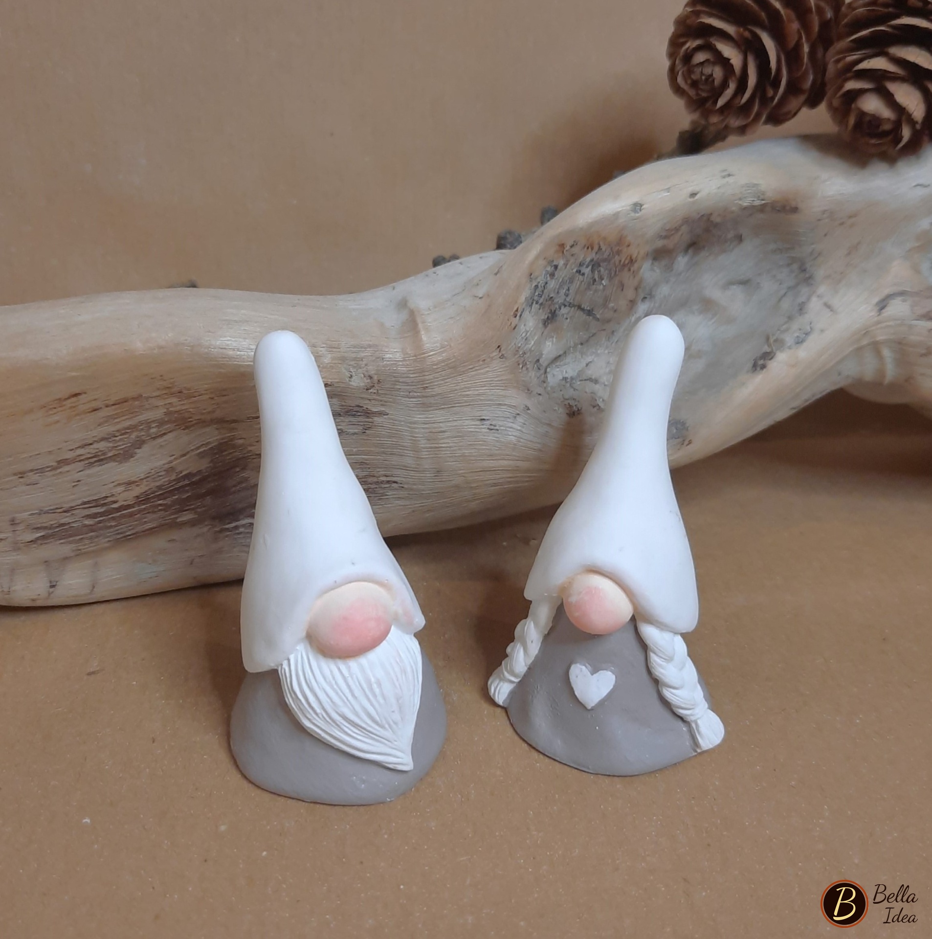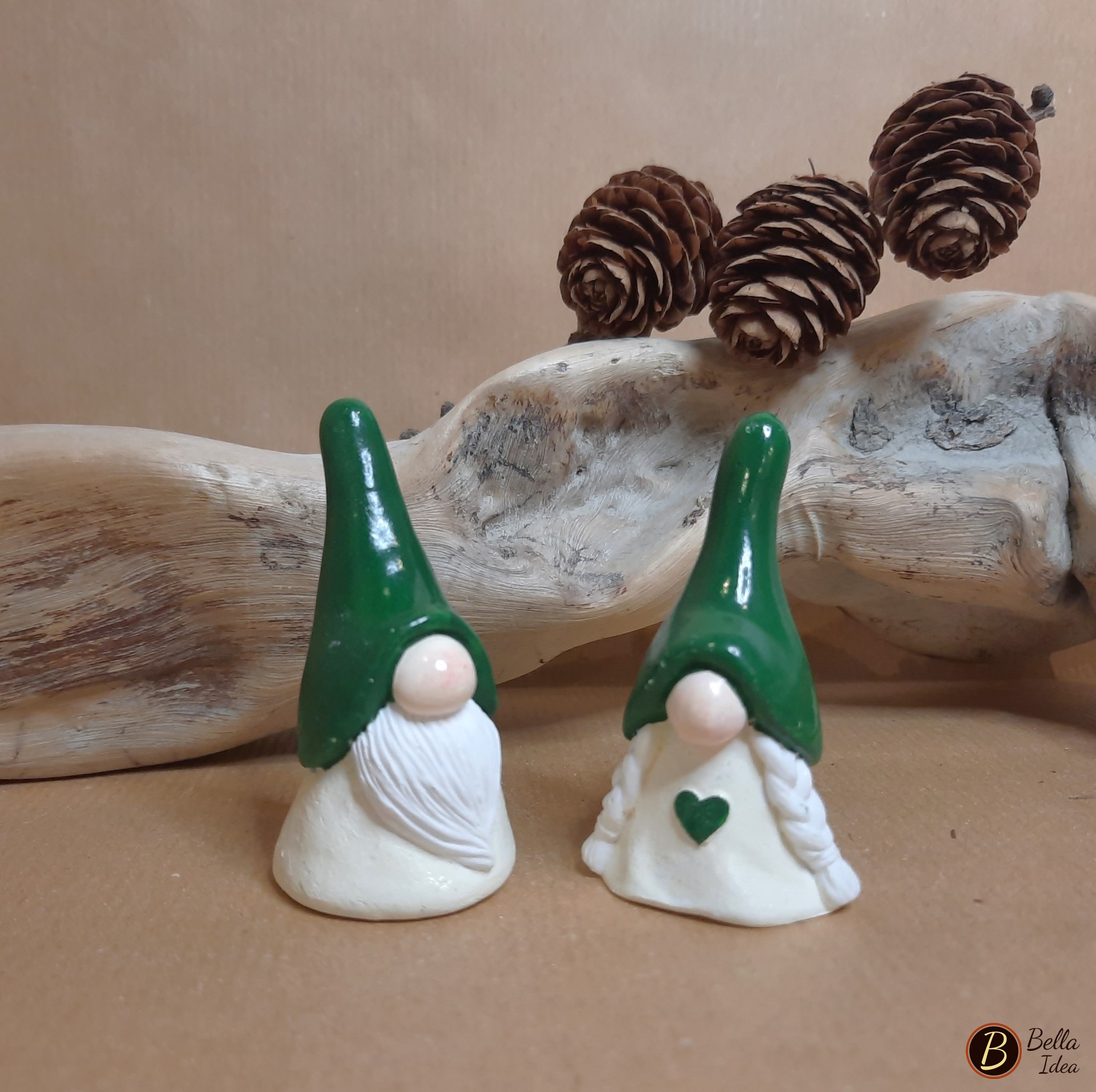 Coppia di piccoli gnomi in gesso sintetico artistico di alta qualità (Diplast GV41) realizzati singolarmente e dipinti a mano.