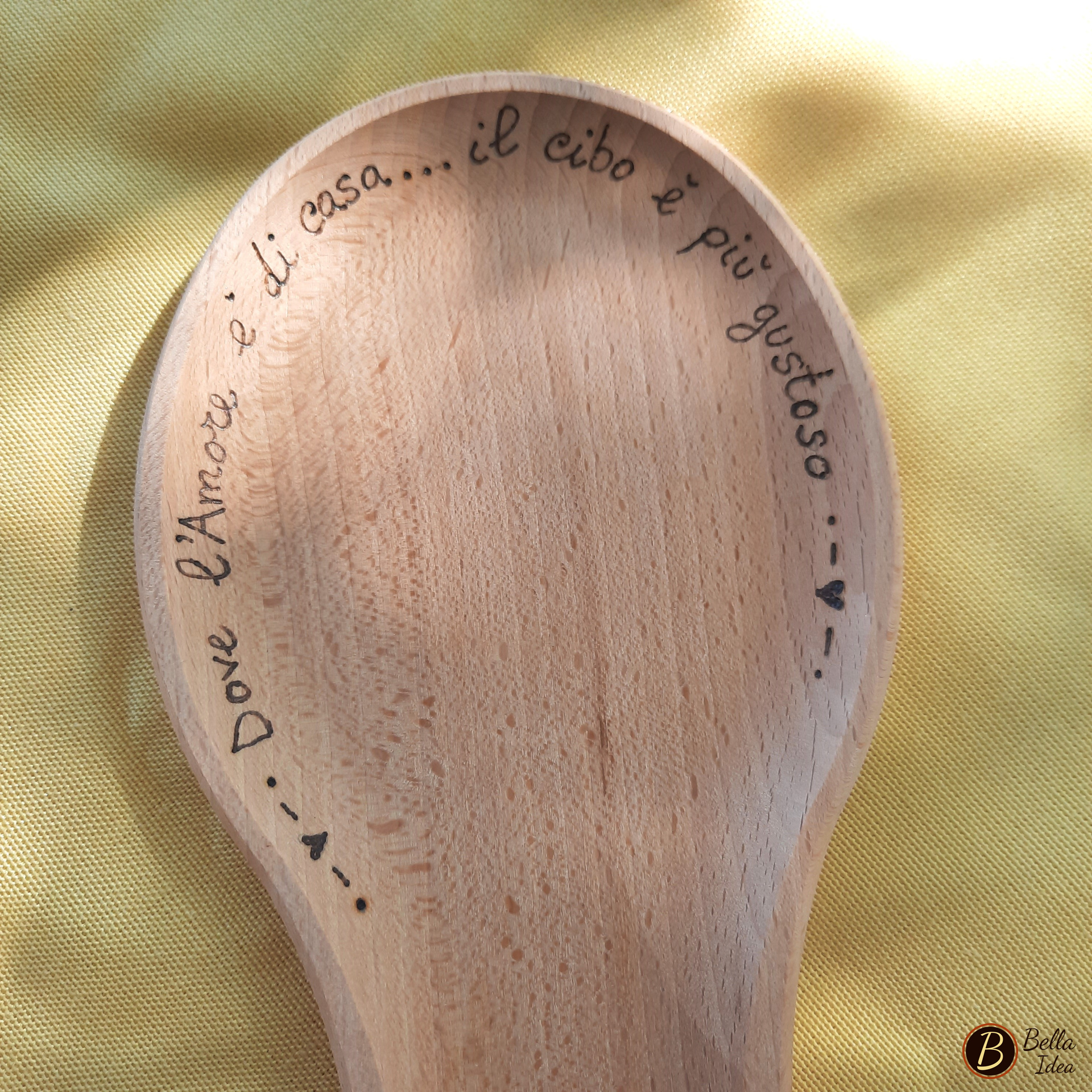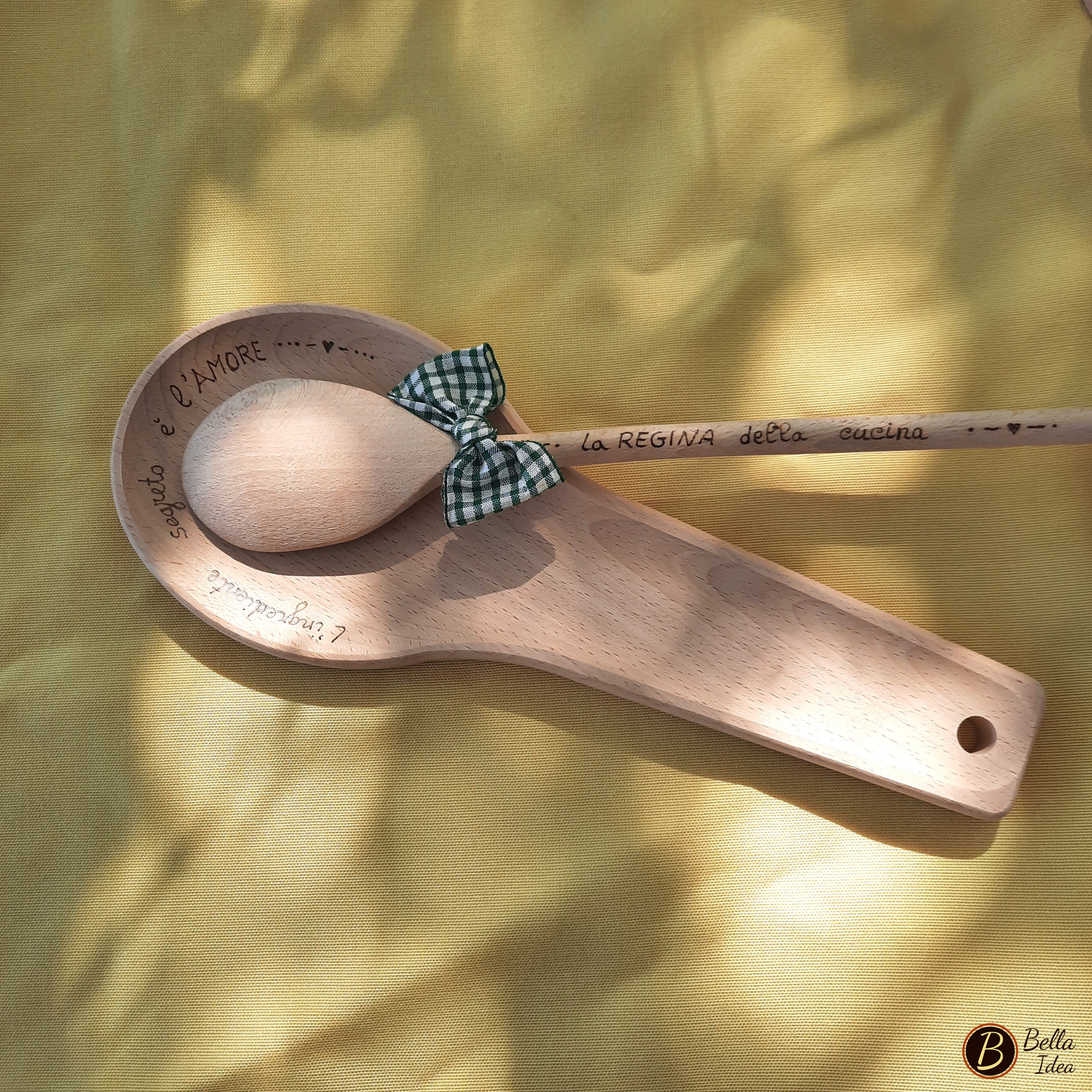 Poggiamestolo in legno di faggio di circa 40 cm, della collezione Scritte. Realizzato in Trentino Alto Adige, artigianalmente da produttori locali e poi decorato a mano con scritte pirografate nel nostro negozio di Como.