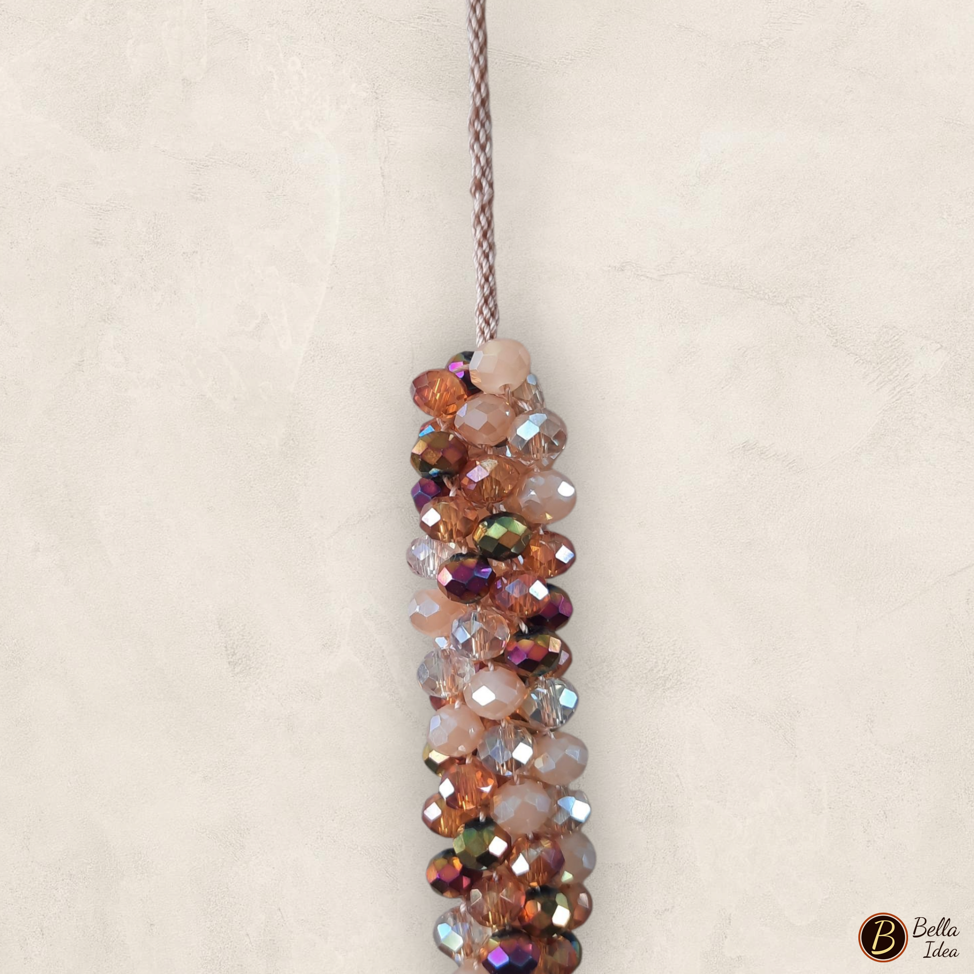 Collana artigianale, realizzata a mano con tecnica Kumihimo, in perline di vetro sfaccettato in diverse gradazioni di rame iridescente, marrone e avorio con chiusura a moschettonedorata.